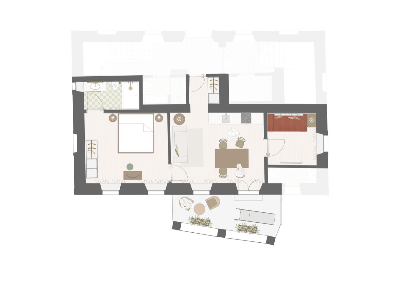 Abbandonatevi al relax in questa confortevole suite al piano terra che può ospitare fino a cinque persone. Dispone di una camera da letto con letto matrimoniale, una camera con un letto da giorno estraibile per due persone e una cucina/soggiorno completamente attrezzata con TV a schermo piatto, bagno con doccia e terrazza con vista sul lago. Inoltre, sono compresi asciugamani, lenzuola, pentole, stoviglie, posate e posto auto.
