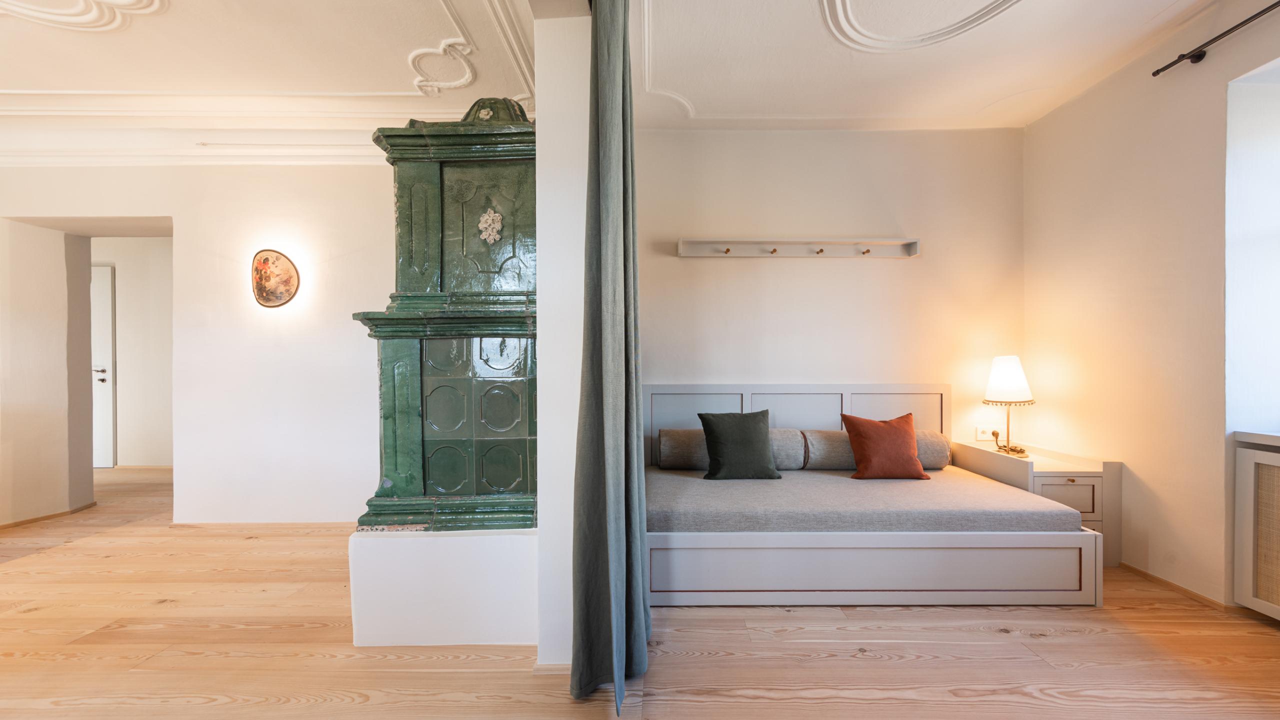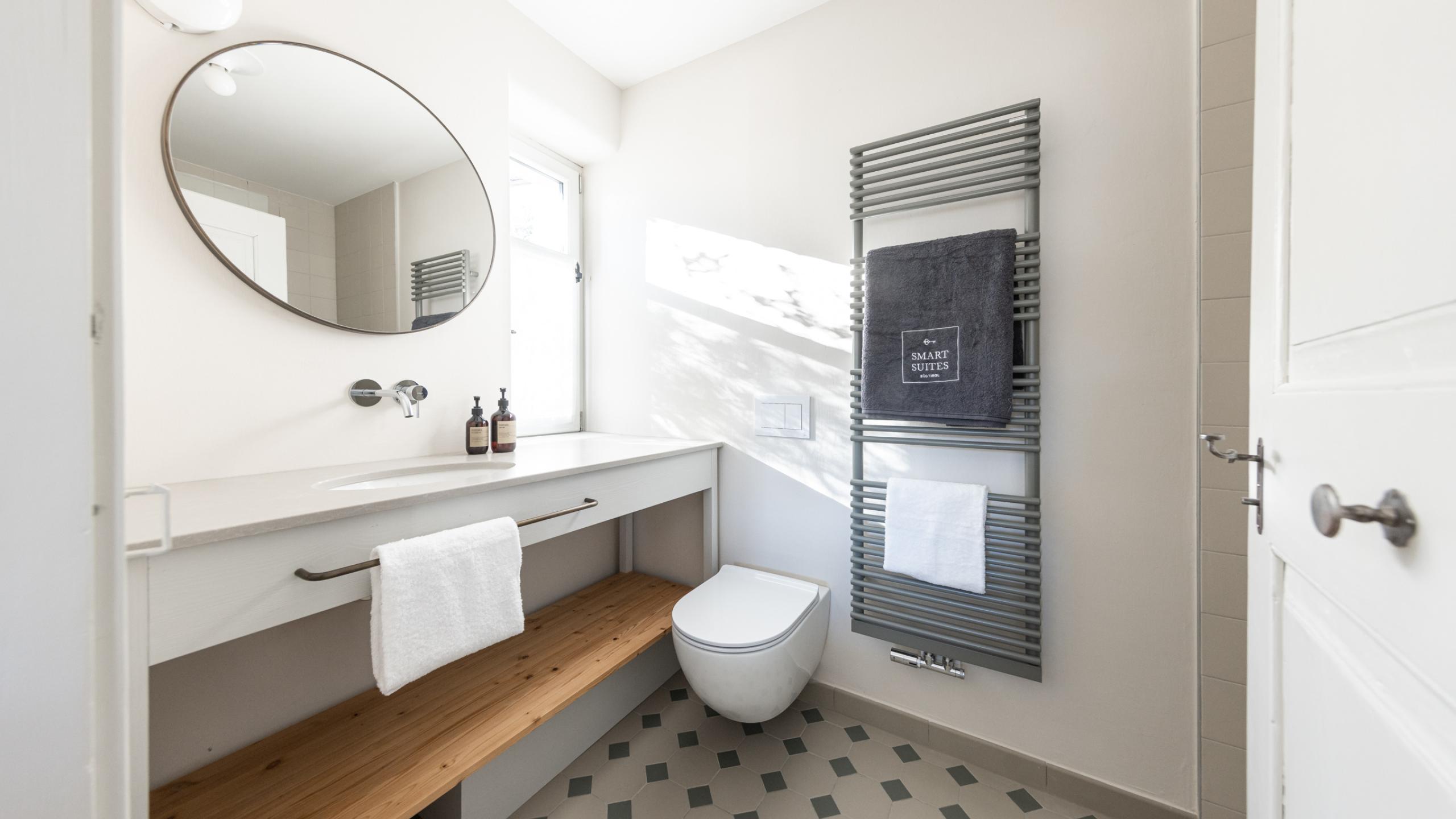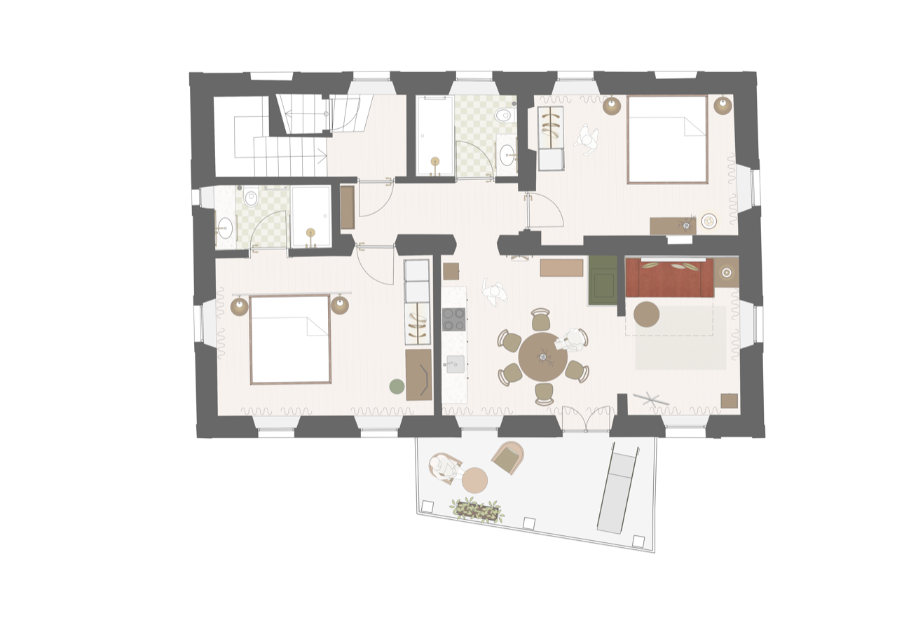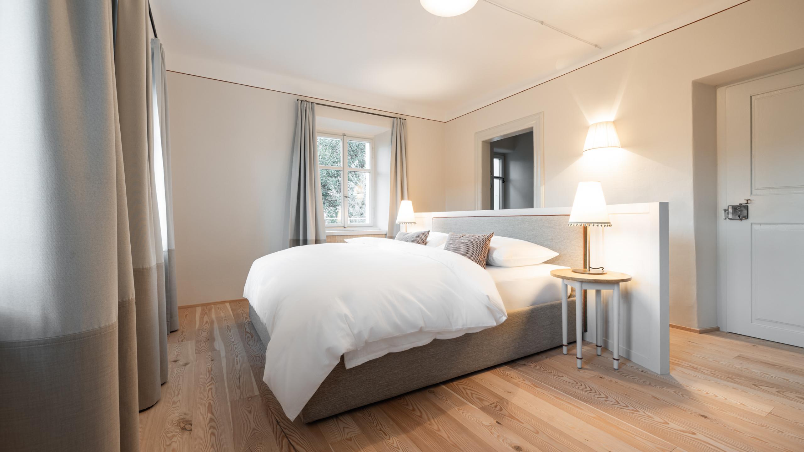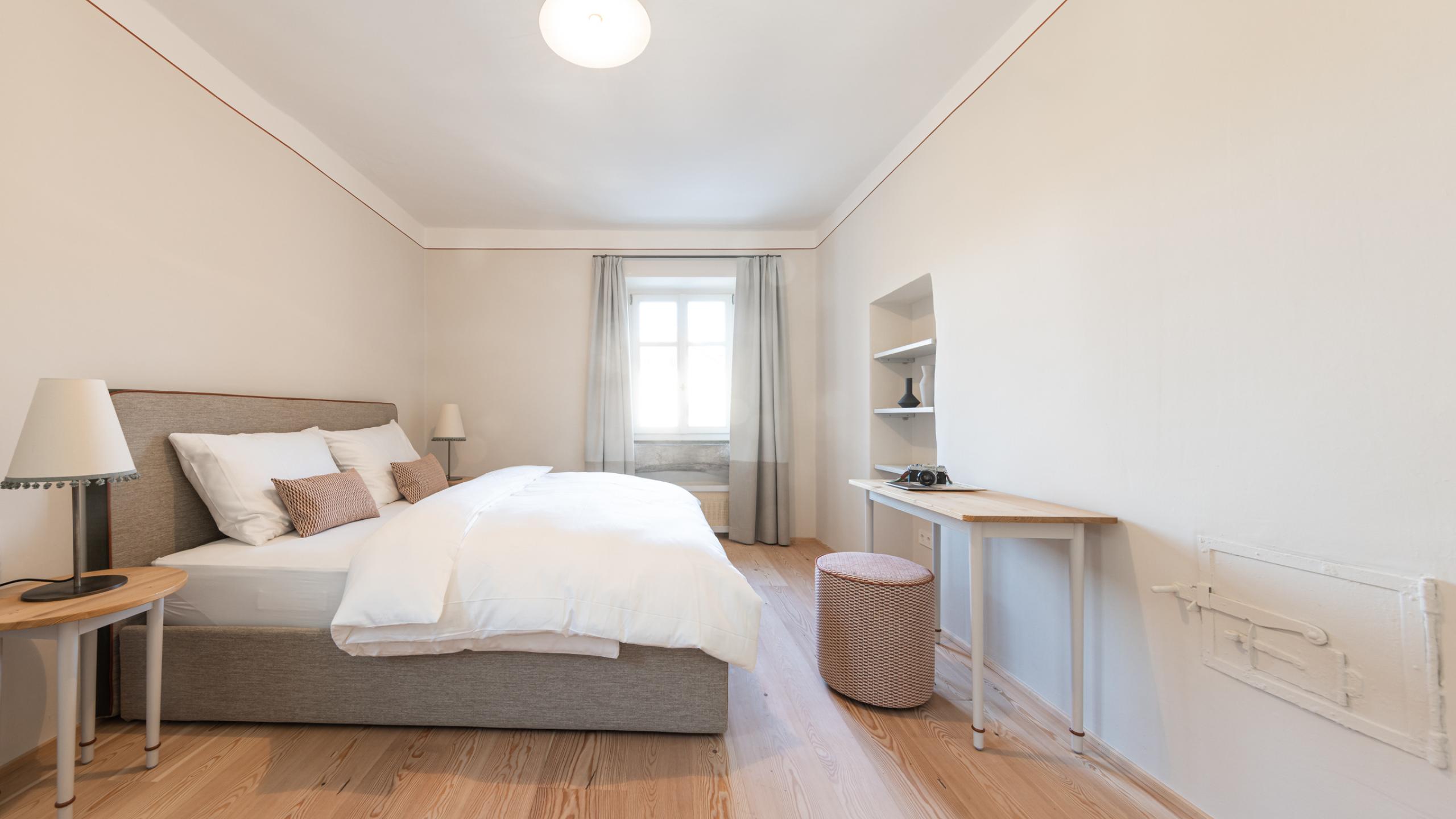 Die komfortable Suite im ersten Obergeschoss bietet bis zu vier Personen Platz. Sie verfügt über zwei Schlafzimmer mit Doppelbett, eine voll ausgestattete Wohnküche mit Flachbildfernseher und ausziehbarem Schlafsofa für zwei Personen, zwei Badezimmer mit Dusche und eine Terrasse mit Blick auf den See. Ein Autoabstellplatz, Handtücher, Bettwäsche, Töpfe, Geschirr und Besteck sind vorhanden.